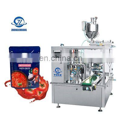 Product ParamentersItem NO.ZC-Y200/250DimensionsL4000mm×W2000mm×H2100mmPacking Speed16-60 Bags/min (depending on products character and filling volume)Packing Bag SizeL: 100-350mmW : 60-200mm/80-250mmWeight1800KGAir Compressed air consemed≤0.6m³ / minAccuracy±1g (≤100g) / ± 1%( >100g) according to materialApplicationSuitable for liquid or semifluid products packing, such as beverages, juice, ketchup, bechamel etc.Working Procedure1.Bag feeding2.Coding3.Opening4.Filling A5.Filling B6.Heat sealing A7.Heat sealing B8.Forming and outputDescription1.According to customer demand for customized, to recommend the appropriate products to customers.2.Storage racks devices which can Satisfy the products short stop ,which can keep the production line work continuously.3.Good service,If you have any questions, you can communicate by telephone video.Recommend ProductsProducts DescriptionCompany ProfileFAQTrade patterns 1. Lead time: 15-20 working days after receive deposit2. MOQ: 1 set.3.30% deposit+ balance payment before delivery by T/T, western union, cash.4. Loading Port: Shantou or Shenzhen Port Export Process 1. We will prepare goods after receive deposit 2. We will send goods to your warehouse or shipping company in China.3. We will give you tracking number or Bill of loading when your goods is on the way 4. Finally your goods will arrive your address or shipping port Frequently Asked Questions Q: First time import, how can I believe that you would send products? A: We are verified company by Alibaba to make transaction success, we support and recommend you to pay money to us by Alibaba Trade Assurance.Q: How about the quality of your product?A: Our products manufactured strictly according to national and international standard-- We have ISO certification-- We take a test on every product before delivery.Q: How to choose the machine type for our bags? A: Pls support us the following information about the bag and the food. 1) Bag pattern (Bag samples or pictures would be appreciated.)2) Bag size 3) The filling weight or volume 4) Material of food: powder/liquid/paste/granular/massiveness Q: What aftersales service or any question about products?A: This machine enjoys 1 year warranty