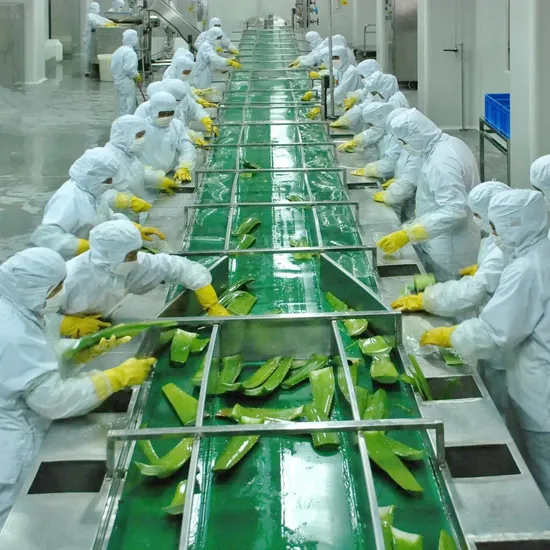Aloe vera processing machine Complete production line for aloe vera cubes, gels, juice and powder, which consists of aloe vera peeling machine, cutting machine, enzyme and filtration machine, low temperature concentration and dehydration system.