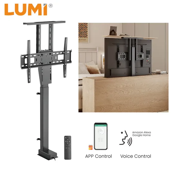 For most 37"~80" TVs Simple control of the TV stand with Amazon Alexa, Google Home or Tuya APP. The LP66E-46ML Motorized TV Lift Stand lifts most 37"~80" large TVs up to 60kg (132lbs) swiftly and quietly. Minimalist and hidden style integrates a TV into many locations. The top of the cabinet can be attached to the stand, which seals the box when the lift is lowered - saving space while maintaining the minimalist look of your home. Meanwhile, customizable TV stand lift range makes the concealment seamless. Quality motor provides automatic up and down lift function with low decibel (<50dB). Anti-collision function protects TV and décor in the limit environment.