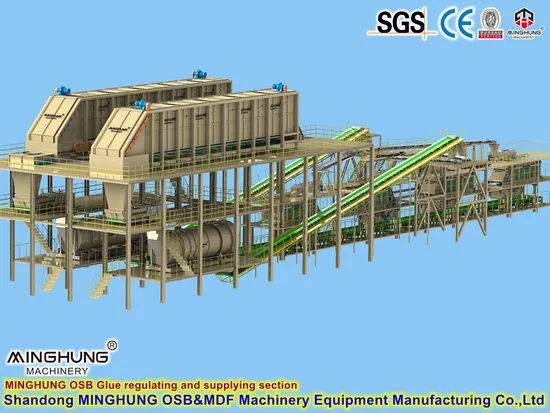 | Preparing Stage: 1. DEBARKER:The logs typically retain outer bark and irregular surface layers. By using a debarker to remove the bark and irregularities from the surface of the logs, it enhances the efficiency and quality of subsequent processing. 2. CHIPPER&FLAKING: Used to chip wood into wood chips, usually using rotating cutting tools to chip wood into wood chips of a certain size. 3. DRYER: Remove moisture from wood chips or timber to ensure that the wood reaches the appropriate humidity and moisture content for subsequent mixing, forming, and hot pressing processes | Mixing&Forming Stage: 4. GLUE MIXER: Equipment used to mix wood chips with adhesive and other additives uniformly, ensuring that the mixture has a certain uniformity and moisture content. 5. FORMING: Used to press the mixed wood chips and adhesive into a board shape, usually using continuous or batch forming machines for molding. |