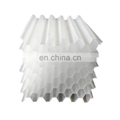 Product DescriptionFactory price 1mm thickness 50mm aperture USA market PP tube settler PP plateSpesifications :Name: PVC Lamella, Tube settlerMaterial: Polyvinyl chloride (PVC)Thickness ; 0.45 - 1 mmDistance between two sheets : 5 cmColor : BlueSize : 1x1 mtr, 1x1.5mtrUsage :1.Sediment pool, wastewater treated pool, Accelerated Sediment pool and clarifier.2.wastewater treatment of paper making3.Water from earth's surface purification4.Treatment of washing water5. Wastewater treatment of Metal processingLoose sheet PP tube settlerTo decrease the cost for shipping, we always pack the loose sheet PP TUBE SETTLER on pallets with film wrap.We will also give you away 2pcs electric iron.PP tube settler blockThe loose sheet has been has the inclined angle 60degree, you just need glue the loose sheet together one by one. Then the block will have 60 degree angle.Detailed ImagesFactory price 1mm thickness 50mm aperture USA market PP tube settler PP plateInclined tube packing is a kind of sedimentation tank filler designed and developed based on the "shallow sedimentation" theory. The filler has a large wet circumference, a small hydraulic radius, and a good laminar flow state during operation. Particle sedimentation is not affected by flocculation and can accelerate particles and moisture. Separate and shorten the precipitation distance of the particles.Size InformationItemPP tube settlerSheet size1000mm*1000mm, or customizedAperture25mm, 35mm, 50mm and 80mmThickness0.45mm-1mmRelated ProductsFAQ1. what material tube settler do you supply? We can supply PVC and PP material for you.2. If we can ask for sample to check? Yes, we can supply free samples for you, you can check our quality first.3. If we can customized the sheet size? Yes, we can do the tube settler width less than 1000mm, Length less than 1500mm.