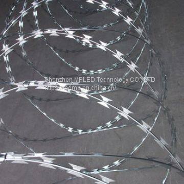 Razor barbed wire is a kind of modern security fencing materials fabricated with razor-sharp steel blade and high-tensile wire. Razor Barbed wire can be installed to achieve the result of frightening and stopping to the aggressive perimeter intruders, with piecing and cutting razor blades mounted at the top of the wall, also the special designs making climbing and touching extremely difficult. The wire and strip are galvanized to prevent corrosion.