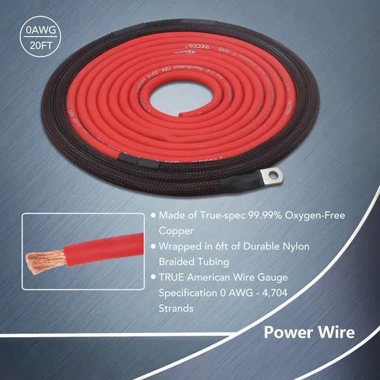 20ft (6.09 meters) Premium True- to-Gauge 0 Gauge OFC red power wire with seamless ring terminal, wrapped in 6ft nylon braiding tubing