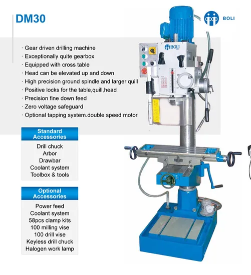 A: A Drilling and Milling Machine is a versatile machining tool that combines drilling and milling operations in a single machine. It can perform tasks such as drilling, reaming, countersinking, and milling on various materials. 2. Q: What are the advantages of using a Drilling and Milling Machine? A: Some advantages of using a Drilling and Milling Machine include increased productivity, versatility in operations, precise and accurate machining, and the ability to perform multiple operations in one setup. 3. Q: What materials can be processed with a Drilling and Milling Machine? A: A Drilling and Milling Machine can process a wide range of materials, including metals such as steel, aluminum, and copper, as well as various alloys and composites. 4. Q: What are the key features to consider when choosing a Drilling and Milling Machine? A: Some key features to consider when choosing a Drilling and Milling Machine include power rating, spindle speed, table size, travel distances, control system (manual or CNC), tool capacity, and safety features. 5. Q: What is the difference between drilling and milling operations? A: Drilling involves creating holes in a workpiece using a rotating drill bit, while milling involves removing material from the workpiece using a rotating cutting tool. Drilling is primarily used for creating holes, while milling is used for various shaping, contouring, and surface finishing operations. 6. Q: Can a Drilling and Milling Machine be used for both small-scale and large-scale production? A: Yes, a Drilling and Milling Machine can be used for both small-scale and large-scale production. The machine's capacity and capabilities can vary, allowing it to accommodate different production requirements. 7. Q: What safety precautions should be taken when operating a Drilling and Milling Machine? A: When operating a Drilling and Milling Machine, it is important to wear appropriate protective gear, such as safety glasses and gloves. Operators should also ensure proper machine setup, secure workpieces firmly, and follow safe operating procedures to prevent accidents or injuries. 8. Q: Can a Drilling and Milling Machine be used for precision machining? A: Yes, a Drilling and Milling Machine can be used for precision machining. With the right tools, setup, and control system, it can achieve high accuracy and produce precise and intricate parts.
