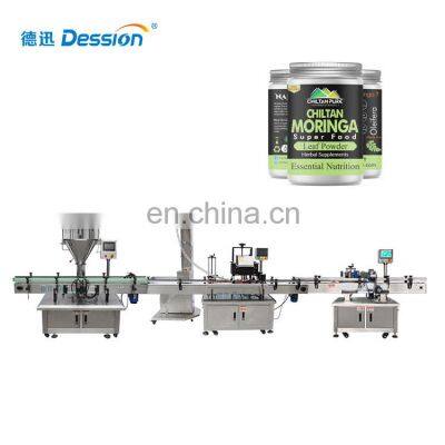 Glass Plastic Bottle Filling Machine Grain Moringa Powder Filling MachineIt is suitable for the filling and capping of various powder , application of agrochemical, daily chemical, food and other industries. Can be matched labeling machine equipment into the production line.Measuring ScrewCapacity15-30 Bottles/minFilling Rangecan be customized (change the screw)Power380V 50/60HZ 3KWMachine Size2000*1200*2000mmMachine Weight300KGLifting capping machine + automatic capping machinePower220V 50HZ 1500WBottle Height38-300mmCap Diameter20-85mmAir Compressor0.3-0.5mpacapacity1600-2400/HRMachine Size2000*800*1600mmMachine Weight200KGLabeling MachinePower220V 50HZ 1200WBottle SizeDiameter 30-100mm ; Height 30-200mmLabel SizeDeight 15-130mmCapacity1500-2400 bottle/HRMachine Size2000*900*1400mmBottle unscramblerDiameterabout 800mmMachine Size1000*900*1300mmConveyor Height800-850mmPower220V 50HZ 0.37KWWeight65KGBottle SizeDia 20-100mm; Height 20-150mmPayment1.T/T and Western Union are accepted2.30% deposit before production and 70% balance before shipment3.All banking charges outside China are on buyersShipping1.Upon receipt of payment , delivery date will be in 15-30 working days,2.By Air, by Sea or by Express (DHL etc)3.Shipment cost will depend on the destination, shipment way and the weight of the goods