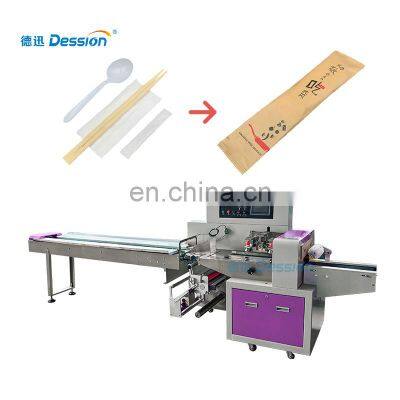 Automatic paper napkin cutlery packing machine napkin wrapping machineMachine IntroductionPackaging ApplicationAutomatic flow packing machine is a widely used packing machine. Suitable for all kinds of product packaging. Including medicalsupplies, vegetables and meat, baked bread, snacks and candy, daily necessities, hardware accessories, etc.Packing EffectThe effect after packaging is back-seal bag. According to demand, other devices can be customized or upgraded to meet other models. For example, pillow bag with hole, bag with label, gusset bag, etc.Machine Structure and ParametersMachine Characteristics1. Double frequency conversion control, the bag length canbe set and cut, no need to adjust the air, one step in place, saving time and film.2. Man-machine interface, parameter setting is convenient and quick.3. Fault self-recognize function, fault display at a glance.4. High-sensitivity photoelectric eye color tracking, digital input sealing position, make sealing position more accurate.5. Temperature independent PID control, better suitable for various packaging materials.6. Positioning stop function, no sticky kuife, no waste film.7. The transmission system is simple, the work is more reliable, and maintenance is more convenient.8. All control is implemented by software, which is convenient for function adjustment and technical upgrade, and never lags behind.ModelDS-250XDS-350XDS-450XDS-600XDS-700XDS-800XFilm Width(mm)Max.250Max.350Max.450Max.600Max.700Max.800Bag Length(mm)45~33065~330120~450130~450120~600120~600Bag width(mm)30~11050~16060~21060~28050~33050~380Products Height(mm)Max.70Max.80Max.110Max.150Max.150Packing Speed(bag/min)40~23030~15030~15020~12030~150Machine Power220V / 380V, 50/60HZ,2.4KWMachine Size(L*W*H, mm)3920*670*13204020*720*14503900*900*14683990*1000*14684400*1100*14604400*1200*1460Machine Weight800KG900KG900KG1050KG1050KG1050KGDetails ImagesMachine WorkflowThis machine is easy to operate. Just set the parameters on the screen, and then you can start the machine. Put the product on the conveyor belt, the machine will automatically pull the film, the bag is formed, sealed, and finally the bag is cut.Multilingual touch screenThe machine supports various language customization, easy to operate.High sensitivity eye sensorThe eye sensor automatically senses the color code to ensure accurate and beautiful packaging effects.Replaceable bag formerWhen you want to change the bag width, you only need to change a different size bag fromer.Electronic control componentUse Panasonic PLC and frequency converter to ensure the stable operation of the machine.Related ProductsWhy Choose UsVR1. Professional and Strong TeamDession has a professional team that can provide customers with various packaging solutions. After fully understanding the customer's needs, we provide the most suitable packaging solution to the customer. Then start the production of the machine. We have a strong production and processing capacity, from the customized processing of accessories to the assembly and debugging ofthe machine. Finally, it is packaged and shipped, and it only takes a week to complete.2. Excellent transportation serviceAccording to the needs of customers, we can provide sea transportation, air transportation, and land transportation services, so that you can get the machine as soon as possible. Provide door-to-door transportation services.3. Timely and effective after-sales serviceChoosing us is not only buying a machine, but also our professional and timely service. 1. When the machine is delivered, we will attach a video of the installation and operation of the machine, so that you can use the machine quickly. 2. All electrical appliances of our machines have a one-year warranty, and we will replace them if they fail. 3. When your machine fails, we will have professional engineers to provide professional online after-sales service to help you solve the problem. 4. If the problem cannot be solved online, we will arrange an engineer to repair it on site within a week.Buyer FeedbackWe have 8 years of experience in foreign trade and export, and now our customers have spread to 90 countries all over the world. With our high-quality machines and professional services, we have won unanimous praise from our customers.Company Profile Dession a leading manufacturer of Packaging machine and supporting facilities, which has successfully developed more than 80 kinds of packaging machines. Dession Packaging Machine has widely applied for different fields throughout the world, such as food/ industrial food, medicines, hotel supplies, disposable goods, rubber goods, daily appliances, hardware fittings, sporting goods, toys etc. Dession has more than 8000 square meters of production plants, 5 production workshops and a parts processing workshop, including small vertical machine production workshops, vertical machine production workshops, pillow machine production workshops, cartoning machine production workshop and filling machine production workshop.FAQQ1:Do you have manual or operation video for us to know more about the machine? Yes, not only manual or operation video, 3D drawing also available to make as per your design,also the video we can make of testing the material from our packaging machine if your packing goods easier for us to find from our local market. Q2:How can I trust you for the first time business ?Please note our above business license and certificate. And if you don't trust us, then we can use Alibaba trade assurance service, guarantee your money, and guarantee your machine's on-time delivery and machine quality.Q3:Is engineer available to serve oversea?Yes, but the travel fee is paid by you. So actually to save your cost, we will send you a video of full details machine installation and assist you till the end.Q4:How can we make sure about the machine quality after we put the order?Before delivery, we will send you the pictures and videos for you to check the quality, and also you 
