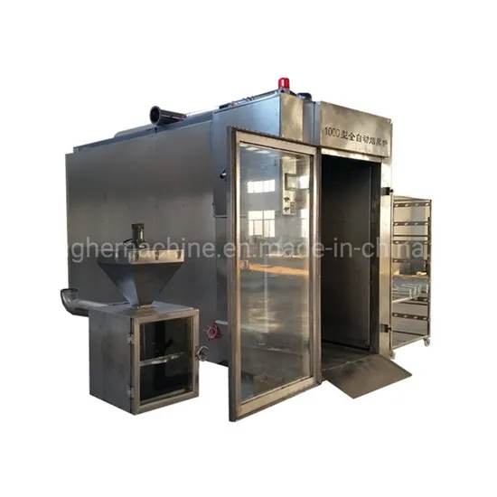 The fuming furnace is mainly composed of furnace body, control box and smoke chamber. The furnace body is a place for smoking, coloring, cooking and drying, with fans and copper coils on the upper part. The electric heating tubes are on both sides. Two temperature probes. There are independent flues on both sides of the furnace, exhaust ports and smoke vents on the upper part, and steam convection ports on the side. The purpose is to ensure that the temperature and smoke in the furnace are consistent from top to bottom, and to avoid inconsistent temperature and smoke color. A drain port is arranged at the bottom of the furnace to discharge the water droplets formed by steam condensation when it is cold.