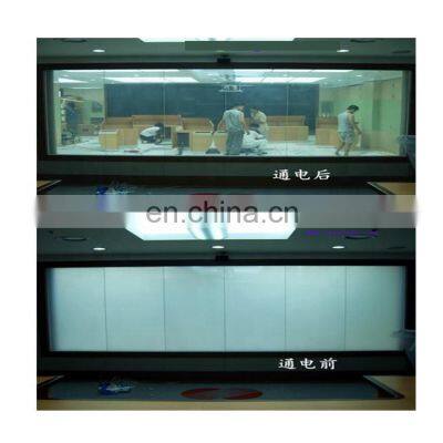 Products DescriptionPower ONPower OFF2.1 Light transmittance:Parellel light:>=66%<=1.5%Visible light:Common Film>=83%>=55%High Transmittance Film>=88%>=57%2.2 Haze:<=3%>=90%2.3 Response time:<10ms<200ms2.4 Viewing angle:>=150°2.5 Voltage:Input:DC12VOperating voltage:AC48VThreshold voltage:<=20V2.6 Frequency:Operating frequency:30~400HzOptimum operating frequency:50Hz2.7 Power consumption:<=5W/m22.8 Continued opening time:>80,000h2.9 Continued ON and OFF times:>80,000,0002.10 Insulation Resistance:>2M Ω2.11 Operating temperature:Between -10℃ and 65 ℃.2.12 Storage temperature:Between -20℃ and 80 ℃.2.13 Thickness:0.65mm2.14 Max dimension:Individual piece<=1.5 * 3.2 metersRoll0.93/1.2/1.5(W) x 20/30/50M(L)2.16 Adhesion for silicon glue & glass:20g/mm2.17 Adhesion for PDLC film:50g/mmProduct DetailsPicture DisplayCompany ProfileFAQQ:Does this need to be installed by an electrician?A: NO, We can provide you a complete closed system that is ready to install with a plug, it can be DIY by yourself. If you would like to hire an electrician to achieve your goal that is your own decision.Q:Can I purchase a sample of Switchable Glass ?A:Yes, we offer samples as your wish.Q:How does a user control the tint of Smart Glass Film?A:It can be Switch, Remote, we can offer the suitable transformer & controller for your choice.Q:Can you cut the film on site....or do you need an absolute measurement from me before the panels are custom made?A: The material is custom manufactured with special laser equipment to ensure straight cuts however you can cut the material if needed to add a logo, trim etc.Q:Can we install this film on the top half of the glass only? We were thinking we wanted to keep the existing decals in place and install film from the decal up to the top of the panel.A:YES - You can install on top half or bottom half only, just be careful for the wiringQ:Does it block the UV harmful rays?A: It blocks over 98% of the harmful UV rays in both its energized and non-energized state.Q:Can we install this product ourselves?A:YES, we offer complete do it your self kits with practice pieces.Q:How long will it take for production and delivery?A: This depends on Material size, total qty order and geographic delivery place.For expedited sample orders, we can ship as fast as 3-7 working days from payment confirmation. If for mass production, it will only last for 7-10 working days approximately.