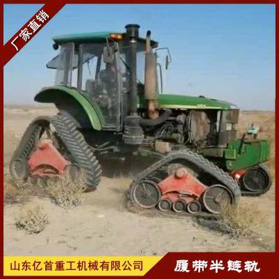 Triangle track walking mechanism and mountain half track tractor, related to the field of agricultural machinery. The triangle track walking mechanism includes a driving wheel, a bracket, a track, a supporting device, a guiding device, and a tensioning device. The driving wheel is set at one end of the bracket, and the supporting device, a guiding device, and a tensioning device are all set at one end of the bracket away from the driving wheel. The guiding device and tensioning device are set on both sides of the bracket, and the driving wheel, supporting device, guiding device, and tensioning device are all coordinated with the same side of the track. The triangle track walking mechanism and mountain half track tractor provided by this utility model are selectively connected to the vehicle body through the triangle track walking mechanism, improving the working efficiency of the mountain half track tractor
