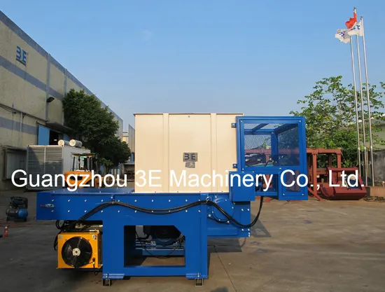 3E MACHINERY's (WTB4080/ WTB40100/ WTB40120/ WTB40150) Forced feeding single shaft shredder is a widely used type of recycling machine. It's an ideal machine widely used in plastics, paper, wood, fiber, rubber, organic waste and non metallic materials. It consists of a single solid shaft with square blades bolted into it. This shaft rotates at about 74-83 RPM, depending on the model, and these blades pass through a bed knife on the base of the cutting chamber. A hydraulic ram continually pushes the material against the shaft of the shredder for continuous cutting. It is almost always used with a screen, which retains the material in the cutting chamber to reduce the material even further. And the standard cut on a single shaft shredder is 25-40mm.