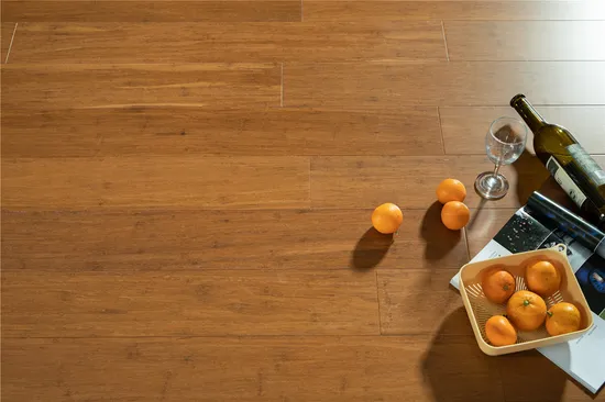 | III. Solid bamboo flooring Top 2mm thickness Strand Woven Bamboo Veneer Multi-ply core (wood) 1.8mm thickness poplar wood veneer Very good foot feeling |