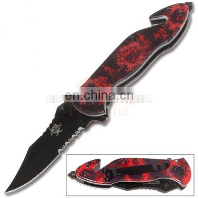 8.5"Series Glass Breaker Assisted Opening Folding Pocket Survival Emergency Rescue Knife specification: * Different handle colors are available, such as: Blue, Red, Black, Green,Orange, etc.* You can also choose 440 or other stainless steel to make the knife blade* The knife blade can be black coated, titanium coated, bead blast finish or satin finish.* We can use other materials to make the knife handle as you request, such as G10,Micarta, Aluminum, Stainless steel, Wood, Plastic, Animal Horn or Animal Bone, etc. Quality description: Locking MechanismLinerlock folding knifeHandle length130mmHandle materialCamo coated stainless steelBlade length85mBlade finishSilver coatedBlade material420 or 440 stainess steelweight145.4GComes withPocket clipRemarksDifferent handle color is available Photo Show: Company Introduce: Yangjiang Homeful Industry & Trade Co., Ltd. was founded in 1998. Our company is manufacturer and sale of all kinds of outdoor knife, camping knife, hunting knife,pocket knife,knife set ,dive knife,survial knife,combat knife,sporting knife,rescue knife,canoe knife,toothpick knife,hunting knife,outdoor knife, fixed blade knife, swiss knife ,utility knife,multi tool,multi tool pliers ,axe,multi hammer ect.Our strengths: competitive price + stable quality + flexible service + quick supply ability+ OEM available Payment team: 1.MOQ: 1000PCS 2.Lead time: about 35 days after order confirmed. Payment terms: 30% deposit, remain 70% against fax copy of Bill of Lading and other shipping documents. 3.Sample time: 3 days without logo, 5 days with logo. warning the knives in this tool are extremely sharp,and should be used with the utmost care and caution Contact us: *If you have any question about our products or your shipping status of your order,please feel free to contact us. *We will answer your message within 24 hours. Website: Add.:Yuyuan 5 Road,Yitong Industrail Zone,Yagnjiang ,Guangdong,China. Welcome to visit our company!!