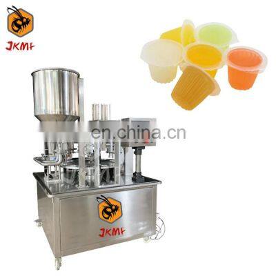 In Stock Fully Automatic Small Jelly Cup Rotary Filling and Sealing MachineProducts DescriptionApplicationThe rotary cup machine is fully automatic to container-loading, fill, foil-loading, seal and overlid stackable containers with reliability and accuracy. This cup filling sealing machine is equipped with PLC and touchscreen HMI, gives flexiblity to configure properly for your application. All control functions are adjustable via the menu-driven operator interface. Precision made and built to last, our cup filling and sealing machine combines innvoative features, customized for a perfect fit every time.The mold of this machine can be customized according to product requirements.The machine can be customized for filling sealing packing ice cream, yogurt, milk, soymilk, chilli sauce,juice, honey, ketchup, mineral water etc.Machine InformationHoney spoon filling machineModelJK-250HSJK-320HSPacking speed800~1000 pieces/hour1600~2000 Pieces/hourFilling volume1~20gMachine power220V/380V,50HZ,4KW220V, 50HZMachine size(L*W*H)1217*1015*13431250*1250*1650Machine weight250KG280KGMain Features1. Digital screen display with numerical setting and flexible operation.2. Imported PLC control system and color touching screen, easy operation.3. Imported film driving system and color sensor enable accurate position.4. PID independent control of temperature, more suitable for different packaging material.5. Multiple automatic alarming functions, maximum deduction the loss.6. Dual encoders enable more stable performance.Machine Working ProcessTouch Control ScreenSet the parameters on the screen, such as filling weight, speed, etc.Falling Cup DeviceSpoon drop down one by one automatically.Metering Filling DeviceAutomatically measure the required weight and fill it into the cup.Foil Film Lid StationVacuum arm suck and put foils on cups for cup sealing.Heating sealing deviceAutomatic high temperature sealing, good sealing performance.Automatic Delivery of Finished ProductsGet perfect finished cup.Why Choose UsJIKE BEE MACHINERY has a professional team to provide customers with various packaging solutions. Fully understanding the needs of customers,engineers design the most suitable solution. We have our own processing and assembly workshop and quality inspection and debugging process to ensure the quality of the machine. After acceptance by the customer, they are packed in international standard wooden cases and shipped.Company ProfileFoshan Jike Bee Automation Equipment Co., Ltd. is a manufacturer of automatic packaging equipment.We are a production-oriented enterprises focused on product innovation, factory direct sales and perfect after-sales service in one.The automatic packaging equipment for granule, powder, liquid and sauce produced by the Jason company is at the advanced level of the industry,it can be customized production automatic material packaging line for all kinds of products .Mainly applicable to: food, hardware, drugs, daily chemicals, pesticides, fruits and vegetables, cosmetics, other industries.The company has its own patent and product technical certification, which can bring customers high quality equipment and worthy of customer trust.Customer PhotosOur customers have covered more than 80 countries around the world.And give us unanimous praise.CertificationsFAQQ1:Do you have manual or operation video for us to know more about the machine? Yes, not only manual or operation video, 3D drawing also available to make as per your design,also the video we can make of testing the material from our packaging machine if your packing goods easier for us to find from our local market. Q2:How can I trust you for the first time business ?Please note our above business license and certificate. And if you don't trust us, then we can use trade assurance service, guarantee your money, and guarantee your machine's on-time delivery and machine quality.Q3:Is engineer available to serve oversea?Yes, but the travel fee is paid by you. So actually to save your cost, we will send you a video of full details machine installation and assist you till the end.Q4:How can we make sure about the machine quality after we put the order?Before delivery, we will send you the pictures and videos for you to check the quality, and also you can arrange for quality checking by yourself or by your contacts in China.Q5:Will you provides the door to door service?Yes. Please offer us your final destination, we will check with our agent to see if it available, and most of the area is ok for us to clearing and sending in your countries.