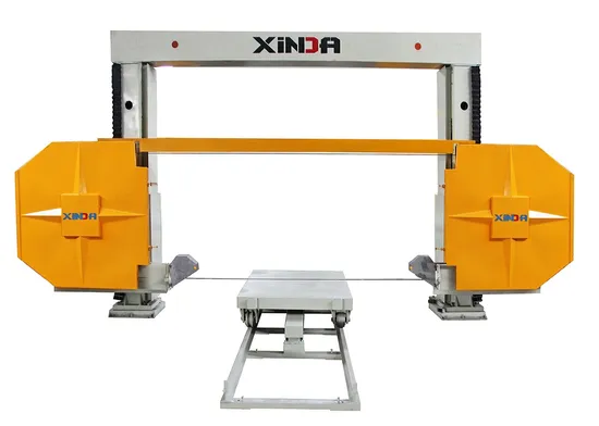 1,KXJ1500 machine has steady structure, including a crossbeam,two upright column,square box,air compressor tensioning unit,two big flywheel. Left side install a driven big flywheel and air compressor tensioning device. tensioning device controls diamond wire tension or loosen, meanwhile keep the diamond wire pressure. Right side install a driving flywheel and main motor, it can control the speed of wire between 0-35m/s via inverter. the machine can cut different kind of stone material.