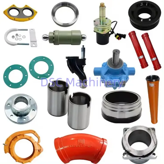Concrete Pump Spare Parts include glasses plate, cutting ring, s pipe, wear sleeve, bushing, upper housing, large housing, rocker arm,discharge port,mixer shaft, mixer paddle, seal gasket, concrete pump delivery piston, delivery cylinder, pipe, elbow, coupling, filter element, sponge balls etc.