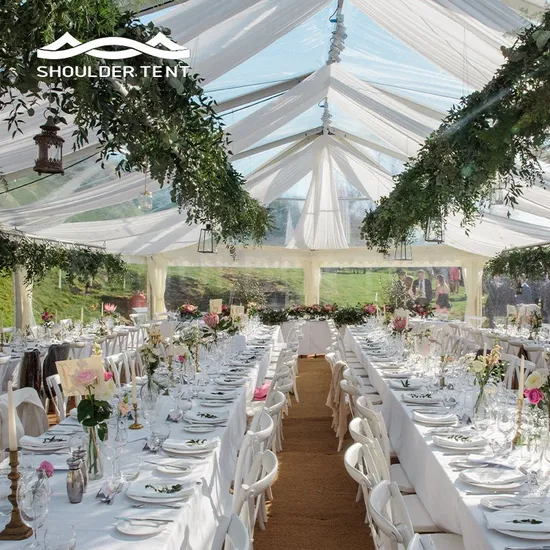 1. Lining, curtain: fit for large activities, decorating inside, different colors as customers' request2. Expansion screw: install the tent on the cement court (free)3. PVC clear windows: transparent, wind-proof and rain-proof (free)4. Flooring system: perfect decoration for any activities (carpet or wooden floor)5. Glass wall/doors system: single door or double wing door for you choose6. Air conditioning system: 3p or 5p and different brand7. Rain gutter: we offer our best project based on your needs8. Carpet: different colors are available9. Decorative lightings10. Table & chairs Product Parameters