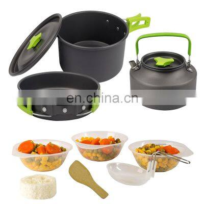 Recommend ProductsContact Info.Products DescriptionProduct NameOutdoor Camping Cookware SetItem NumberK379Place of OriginJiangmen CityColorGreen/ Black/ OrangeMaterialAluminum & PlasticProduct Includes1 Pot with lid, 1 pan, 1 teapot, 1 spatula, 1 sponge, 1 soup ladle, 3 bowls, 1 storage bagBox Size18.5*12.5*18.5cm, 820gCarton53*39*39cmPackaging1set/ brown box, 16sets/master cartonProduct packagingWhy Choose UsOur PartnersFAQQ1: Are you manufacturer?A1: We are both Manufacturer and Trade company. You can get the best service and the best price from us.Q2: What is your MOQ? Is a small order OK?A2: Our MOQ is flexible. You can order as much as you want. Follow your need.Q3: How about the samples?A3: We can arrange the samples to you if you need it.Q4: OEM or ODM is available?A4: Yes. We provide both OEM & ODM.Q5: Can I print the LOGO on the carton box?A5: Sure. We will send the design document of carton box to you for customization. The MOQ of the customized carton box is 200.Q6: How long is the delivery time usually?A6: We usually have enough stock. Within 200 pieces can be shipped within 1-3 days.Q7: How about the shipping cost?A7: The size and weight of each product are different, so you can contact us at any time to help you calculate the shipping cost.
