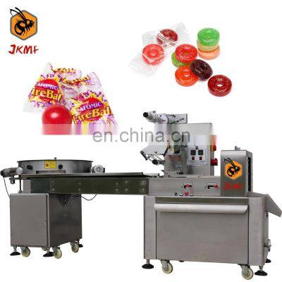 500bags/min JKMF High Speed Candy Pillow Packaging Machine For Hard Candy Toffee Packing Machine Chocolate Ball Packing MachineMachine IntroductionThe JKMF flow packing machine features quick, easy changeover and adjustment that minimizes product and film waste and reduces maintenance costs.The machine working starts with a cylindrical roll of film. The flow wrapping machine will transfer the film from the roll and through to the forming collar (sometimes referred to as tube or plow). At the same time, a conveyor has lined up individual products for wrapping. The film is fed through the collar and the product is surrounded with film, sealed and the film is then cut. The finished individual product is then gathered downstream to be bagged or cartoned prior to boxing and palletizing.This is a flow packing machine specially customized for sweet food & candy. It is suitable for individual packing and multiple packing of all kinds of candy .Such as hard candy, marshmallows, gummy bears, lollipops, wave candies, pinwheels, chocolate balls, toffee, etc.Machine InformationJKMF flow packing machine, a customized model for candy packing. The packaging speed is fast, the efficiency is high, the packaging process is clean and hygienic, and the operation is simple. Choose the right packaging equipment for your operation and get the highest levels of safety, shelf life, flavor retention, and appearance at every stage of production.The process of automatic bag making, date coding, labeling, weighing, and packaging is completed at one time.ModelJK-250BJK-350BJK-450BJK-600BFilm WidthMax.250 mmMax.350 mmMax.450 mmMax.600 mmBag Length65~330 mm65~330 mm120~450 mm130~600 mmBag Width30~110 mm50~160 mm60~210 mm60~280 mmProduct HeightMax. 40/55 mmMax. 45/80 mmMax. 110 mmMax. 110 mmPacking Speed40~230 bags/min40~230 bags/min30~180 bags/min20~150 bags/minMachine Size(mm)3700*670*14503770*720*14503990*900*14683990*1000*1468Machine Weight450KG500KG550KG800KGMachine Voltage220V, 50/60 HzMachine Power2.4KW2.8KW3.2KW4KWMain Features1.Dual frequency conversion control, Bag length can be set and cut in one step, saving time and film.2.Interface features easy and quick setting and operation.3.Self failure diagnosis, clear failure display.4.High sensitivity photoelectric eye color tracing, numerical input of cutting sealing position for extra accuracy.5.Temperature independent PID control, more suitable for packaging different materials.6.Positioned stop function, without sticking knife or wasting film.7.Simple driving system, reliable working, convenient maintenance.8.All control is realized through software, easy for function adjusting and technical upgrade.Machine DetailsMachine Control CenterThe packaging parameters setting is set on the HMI screen (human machine interface). A pulse is generated for machine movement, and this is transferred to the PLC (programmable logic controller).Including packaging size, packaging speed, etc. High Speed Turntable Feeding DeviceThe contact surface is made of food-grade 304 stainless steel, and 3 independent motor-driven brushes assist the automatic feeding of the product.Film Holder With Date PrinterWhen the HFFS packaging machine is operating, the film is usually pulled off the roll by film transport belts, which are positioned to the side of the forming tube which is located at the front of the machine. A date printer can be installed on the film holder, so that the production date and other information can be printed on the colleague of the packaging.Replaceable Bag FormerThe film enters a forming tube assembly. As it crests the shoulder (collar) on the forming tube, it is folded around the tube so that the end result is a length of film with the two outer edges of the film overlapping each other. Middle Bag Heat Sealing DeviceThe horizontal seal bar, which is hot, moves forward and makes contact with the horizontal overlap on the film, bonding the layers of film together.Bag Heat Sealing Cutting DeviceA set of heated horizontal sealing jaws come together to make the top seal of one bag and the bottom seal of the next bag. While the sealing jaws are closed, the product that is being packaged is dropped down the middle of the hollow forming tube and filled into the bag.This is a complete packaging process, you will get the perfect packaging finished product.If your product needs to be filled with nitrogen to ensure the freshness of the product, then you need to purchase a set of nitrogen production equipment. In addition, our machines can also be equipped with labeling machines, date coding machines, etc. to meet your production needs.Why Choose UsJIKE BEE MACHINERY has a professional team to provide customers with various packaging solutions. Fully understanding the needs of customers,engineers design the most suitable solution. We have our own processing and assembly workshop and quality inspection and debugging process to ensure the quality of the machine. After acceptance by the customer, they are packed in international standard wooden cases and shipped.The machine has more than 10 advanced patented technologies, CE certificate, ISO9001 certification, etc.We will package the machine's instruction manual and a USB flash drive with machine operation videos together with the machine.Ensure that you can use the machine as soon as you receive it. If you have something you don't understand, our after-sales team will also help you answer in time.Our customers have covered more than 80 countries around the world.And give us unanimous praise.Company ProfileFoshan Jike Bee Automation Equipment Co., Ltd. is a manufacturer of automatic packaging equipment.We are a production-oriented enterprises focused on product innovation, factory direct sales and perfect after-sales service in one. Mainly applicable to: food, hardware, drugs, daily chemicals, pesticides, fruits and vegetables, cosmetics, other industries.The company has its own patent and product technical certification, which can b