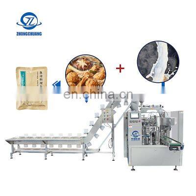 Automatic Envasadora Premade Bag Rotary Retort Pouch Granule Liquid Mixed Filling Sealing Doypack Packing MachineProduct ParamentersItem NO.ZC-W200/250DimensionsL4000mm×W2000mm×H2100mmPacking Speed16-60 Bags/min (depending on products character and filling volume)Packing Bag SizeL: 100-350mmW : 60-200mm/80-250mmWeight1800KGAir Compressed air consemed≤0.6m³ / minAccuracy±1g (≤100g) / ± 1%( >100g) according to materialApplicationSuitable for liquid or semifluid products packing, such as beverages, juice, ketchup, bechamel etc.Working Procedure1.Bag feeding2.Coding3.Opening4.Filling A5.Filling B6.Heat sealing A7.Heat sealing B8.Forming and outputDescription1.According to customer demand for customized, to recommend the appropriate products to customers.2.Storage racks devices which can Satisfy the products short stop ,which can keep the production line work continuously.3.Good service,If you have any questions, you can communicate by telephone video.Recommend ProductsProducts DescriptionCompany ProfileFAQTrade patterns 1. Lead time: 15-20 working days after receive deposit2. MOQ: 1 set.3.30% deposit+ balance payment before delivery by T/T, western union, cash.4. Loading Port: Shantou or Shenzhen Port Export Process 1. We will prepare goods after receive deposit 2. We will send goods to your warehouse or shipping company in China.3. We will give you tracking number or Bill of loading when your goods is on the way 4. Finally your goods will arrive your address or shipping port Frequently Asked Questions Q: First time import, how can I believe that you would send products? A: We are verified company by Alibaba to make transaction success, we support and recommend you to pay money to us by Alibaba Trade Assurance.Q: How about the quality of your product?A: Our products manufactured strictly according to national and international standard-- We have ISO certification-- We take a test on every product before delivery.Q: How to choose the machine type for our bags? A: Pls support us the following information about the bag and the food. 1) Bag pattern (Bag samples or pictures would be appreciated.)2) Bag size 3) The filling weight or volume 4) Material of food: powder/liquid/paste/granular/massiveness Q: What aftersales service or any question about products?A: This machine enjoys 1 year warranty