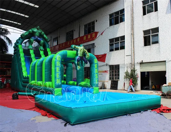 Channal's the hulk water slide with slip and slide will be a hot rent out for any water party and kids' event. This giant green monster inflatable water slide features a height of 20 feet, it comes with two slide lanes, also two slip and slide lanes with a shared water splash pool. Will entertain many kids at the same time. You may also find our another the hulk inflatable water slideinteresting.