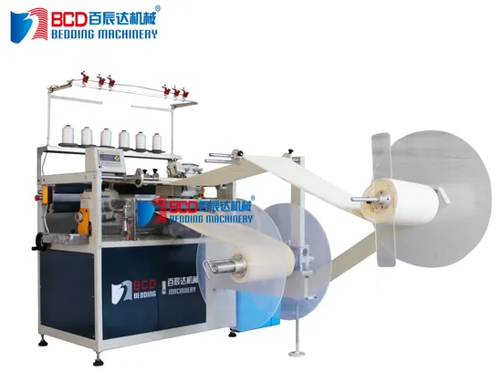 Product Description Product Application This machine is mainly used for double-edge overlocking mattress border fabric. It is equipped with 2 JUKI sewing head, work synchronously. The 2 sewing head is driven by 2 different inverters, and the feeding fabric is by polyurethane rollers, winding system work synchronously, auto cut the surplus fabric. Furthermore, this machine is equipped with waste collection and finish fabric auto stop device.