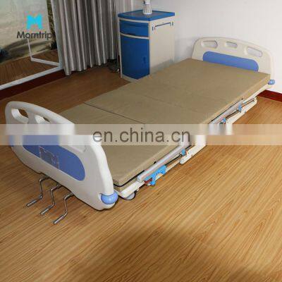 Product DescriptionThis three-function hospital bed has back-rest, leg-rest and height adjustment functions. During daily treatment and nursing, the position of the patient's back and legs are appropriately adjusted according to the needs of the patient or nursing need, which helps to relieve the pressure on the back, legs and promote blood circulation.And the height of the bed surface to the floor can be adjustable from 250mm to 530mm. Stainless steel cranks can be folded and hidden to avoid bruising to nurses and visitors.Headboard/FootboardDetachable ABS anti-collision bed headboardSide railsCollapsible aluminum alloy guardrails or stainless steel guardrailsBed surfaceHigh quality large steel plate punching bed frame L1950mm x W900mmBrake systemCasters with brakesCranksStainless steel fold cranksBack lifting angle0-75°Leg lifting angle0-45°Max load weight≤250kgsFull Length2200mmFull width960mmHeight of the bed surface250mm ~ 530mmOptionsMattress, IV pole, Drainage bag hook, bedside locker, overbed tableDetailed ImagesSafety Side RailsAluminum alloy guardrails can prevent patients falling off the hospital beds,which can keep patient move safely. The side rails are collapsible, can be folded on the bedside when caregivers offering caring.ABS Headboard & Stainless Cranks 1. Headboard & footboard made of ABS material, each corner is equipped with anti-collision bumpers, which can reduce the impact of the collision.2. 3 stainless steel fold cranks at the bed tail, effortless for caregivers to adjust patients' position.Brake SystemFour 125mm mute casters made of ABS material. Each caster with a brake to control.Our AdvantagesProduction Advantages1. Production base over 5000 m2, over 10000 m2 new factory under construction.2. More than 100 skilled workers and semi-automatic production lines, which lead to a short lead time: 10 days for a 40HQ.R&D and QC Advantages1. Our R&D team has more than 15 years of experience in the hospital bed industry, can solve various product design problems according to customer needs.2. Quality control almost goes through the entire production process. Every part of the bed must be 100% examined before handing it over to the next production process.Overseas Warehouses1. We have warehouses in both Korea & Russia, which can deliver fast to customers there. 2. Also can help us deal with after-sales issues faster.After-sales Advantages1. One year warranty, free spare parts.2. Guarantee 5 years repair, offer spare parts with cost price. 10% off new beds change.3. 10 years spare parts supply guaranteed.Related Products$ 465 - $ 500 Pieces10 Pieces (MOQ)$ 635 - $ 700 Pieces10 Pieces (MOQ)$ 465 - $ 500 Pieces10 Pieces (MOQ)CertificateISO 13485: 2016ISO 9001: 2015CE CertificatePacking&ShippingInner PackingEvery part of the bed is packed or wrapped with bubble bags, in case the transport collision damages the components.Outer PackingOuter cartons are wrapped with PET strapping, effectively avoid packages to be deformed and damaged.Container LoadingBefore loading into the containers, every package is packed under high standards and must go through strict quality control processing. Company IntroductionEstablished in 2015, Morntrip is a professional manufacturer of disposable non-woven products. Covering an area of 50,000 square meters, our factory is located in Xiantao city, the most famous place of domestic non-woven industry, which also has the most complete supply chain system and the richest production experience of non-woven products in China. Xiantao is only two hours' drive away from Wuhan port, the biggest inland port of China, which is very convenient and economical for FCL transportation.Focused on non-woven product manufacturing, R&D, and marketing for more than 20 years, we have developed into a large-scale manufacturer. We have integrated a complete product supply chain, which including raw material production, finished product processing, packaging, and transportation. More than 20 years’ production experience also made us become one of the most famous KOLs in this field.We are certified with China medical device production license, CE and ISO 13485 by TUV Rheinland. Our main products including disposable medical masks, coveralls, surgical gowns, lab coats, doctor caps, bedsheets, shoe covers, and other kinds of protective equipment. We also produce non-woven fabrics by ourselves, including spun-bond, melt-blown, and SMS non-woven.In order to stay competitive in this field, we have been always improving ourselves:1. Started operating Morntrip brand in 2015, which has become a famous export trading company in Wuhan exporting field.2. In 2017, we imported a non-woven fabric production line of SMS from Japan, which can produce both spun-bond and melt-blown polypropylene.3. Over 30,000m2 modernized new dust-free workshops were put into production in 2018, which made our total production bases more than 50,000 m2, total employees over 300.4. In 2019, our annual sales reached 200 million RMB, non-woven fabric annual output over 7,000 tons, and can deliver finished products over 30 pieces of 40HQ container every month.5. In 2020, we were designated suppliers to help prevent the pandemic in Hubei.6. In 2021, Morntrip Supply Chain Company was established, we signed cooperation agreements with well-known enterprises in China. New products like hospital beds and industrial protective gloves have been added to our new business plans.Our customers are from all over the world, such as North & South America, Europe, Middle East, East Asia, South East Asia, and so on. We always put our customers in first place during our cooperation and provide them with the best products and services. We will keep learning and innovating in the future. We also believe that Morntrip will keep growing up and go further with our customers together.
