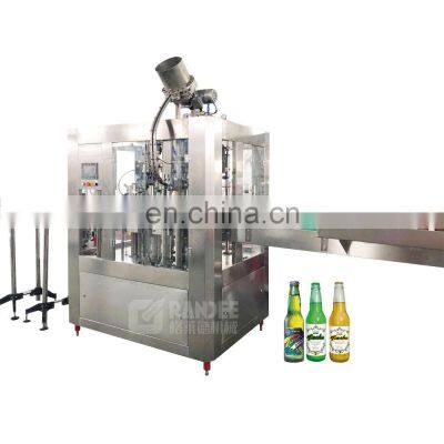 Automatic 500-800BPH 3 in 1 glass bottle beer filling capping machine small beer bottling machineProduct DescriptionMachine description:This machine integrating washing bottle, filling and capping in one unit.1.Feeding bottle on belt by manual, bottles going to washing part by conveying belt, washing bottle gripper gripping bottle neck, along washing bottle pathway overturning 180°, water pump opening, water spraying bottle inside and outside, then drying along washing bottle pathway overturning 180°, bottles come out by conveying belt, and entering into filling position, with hanging bottle neck positioned filling machine lifting mechanism on cliping bottle neck plate, make the bottles lift up, fit to filling . During lifting process, check bottle on cliping bottle neck or not. If with bottle, then starts filling beer. If no bottles, then the filling valves remain close state. After finishing filling, bottle lifting mechanism go down, the filled beer bottle sent into capping machine by star wheel, after capping, the bottle is sent out through star wheel to conveyor belt. 2.Emphasis on opening machine design, minimized the machines’ components, smooth and easy design, washing, filling capping part in one working table, take deep consideration of corrosion resistance , all parts contacting with liquid uses SUS304, and design for all pipes and connection joint, bending radius , design is streamline without hygiene corner. 3.Consider bottle characteristics, adopt cam lifting way, stable operation, and increase filling central device to make the filling more accurately. 4. For beer characteristics, beer tank and filling valve is customized made.Additional increase diaphragm valve to ensure beer supplying stability ,reduce beer foaming, make sure that beer level accuracy. 5. Pressure preparation is combined controlled by solenoid valve under working table, with PLC and electrode points pressure gauge. Beer tank is prepared pressure first, then feeding beer. If too big pressure with feeding beer, beer tank will air exhaust to set up pressure, if pressure is not enough, CO2 will feed to beer tank for pressure preparation to reach to required pressure. 6. The main purpose of water injecting and foaming device is filtered by high pressure and heated water , and for high pressure waterline sent into bottle , and make bubble, and take out air from the bottle, and ensure the quality of beer. Machine show: DetailsWashing part Rinsing empty bottle, filling, and capping functions are integrated in one system, fully automatic synchronized working.Bottletravels on neck to neck from in-feed till out-feed resulting scratch free movement of bottle. Filling part Pressure or vacuum filling nozzles deliver fast, efficient, and accurate dispensing with minimal dripping and leakage.Capping part No Bottle No Filling, no caps no capping, no caps auto stops.When bottle jam auto stop, machine accident auto stop.Open the window when machine running, machine auto paused.Heavy duty stainless steel filling pump & rinsing pump.Food grade 316L or 304stainless steel contact parts, smooth & fine Polish, no dead angles.Transmission Adopt screw feeding bottles, different bottle diameter with different feeding bottle screw.Main transmission adopting frequency conversion motor will be sent to decelerate box through stair belt, and then lead the whole machine running.cleaning cup Main technical parameter:ModelBGF6-6-1BGF14-12-4BGF18-18-6BGF24-24-8BGF32-32-10BGF40-40-12BGF50-50-15Rinsing heads6141824324050Filling heads6121824324050Capping heads1468101215Suitable bottle sizeH:170-320mm Diameter:50-100mmCleaning pressure(MPa)3.80.25-0.3Capacity(b/h)80020003500600090001100018000Power(kw)1.52.23.53.85.57.510Dimension(mm)1900X1700X22002100x1800x25002600x2100x25003200x2300x25004200x2600x25004800x2800x25005700x3600x2500Weight(KG)15002300350046006500850010000Related productGlass bottle washing machine The bottle cleaning process is as follows: enter the bottle - soak spray - internal brush - the bottle is filled with clean water spray - drain - out of the bottle. Automatic sticky / wet glue labeling machineLabeling speed: 60~100B/MinLabeling precision: +1mmBottle size Height : 40mm~~250mm Diameter:20mm~~110mm(customized)Label size:Height :10mm~~150mm Length :15~~300mm(customized)Inner diameter of scroll :Φ76mmOuter diameter of scroll:Φ300(Max)Carton box packing machine Film material: PE / carton box Shrink membrane thickness: 70~100umCapacity: 8-35packages/ min can be chosenConveyor belt max width: 600mmHeight is: 1000~1100mmCompany Information Workshop deatilsProject casesOur ServicesCustomer's service:1.Grandee company can provide turn-key project for you, only you have any idea to start beverage factory plant.2. Grandee company have professional design team, our engineer can draw bottle samples and flow chart ofworkshop for you .3. Grandee company give you the best quotation for all kinds of beverage production, only you can tell me which kind of drink you want to product, what is your capacity(how many bottles one hour) what is you bottlematerial, pet or glass,etcAfter service:1. We send the engineers to help installing, commissioning and training, the engineers start from our factory area.2. We supply below necessary documents with the machine: a. Machine layout b. Electricity diagram c. Machine certificate d. General manual book/maintenance book3. After one year guarantee, the seller provides payable spare parts and technician’s VISITING maintenanceservice.FAQQ1: How to find suitable machine or complete beverage production line?A1: Looking for beverage filling machine in www.grandeemachine.en.china.cn •Enquiry: Contact us by email, phone call, fax, Instant Messenger (Trade manager, Skype, WhatsApp, Wechat) and let us know your requirements • Discussion: Specify the items and what are you exactly looking for. Q2: Are you a trading company or a manufactory?A2: We are the manufacture of water/beverage filling machine and w