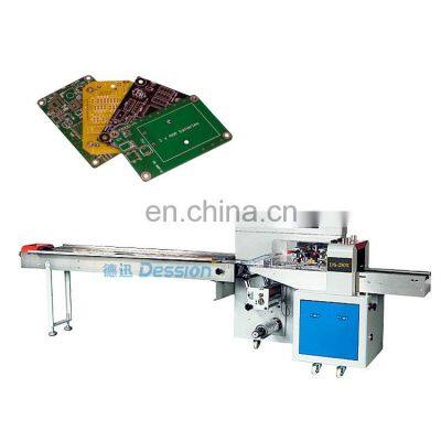 Pcb Packaging Machine With Fill And Seal Function Working Video LinkPlease click https://youtu.be/B5QjexMGSig Product Description Main Features• For Stable Performance: Dual inverters controller, upgradable PLC system, self-failure diagnosis, double encoder. • For Easy Operation: Touch screen monitor, independant temperature PID controller, • For Adapability: one set of machine can be applicated to different kind of product via optional devices, such as air-filling device, feeding line, etc. ITEMDS-250XDS-350XDS-450XDS-600XFilm WidthMax.250mmMax.350mmMax.450mmMax.600mmBag Length45-90mm65~190mm90-220mm150-330mm65-190mm120-280mm 90-220mm150-330mm120-450mm130-450mmBag Width30~110mm50-160mm60-210mm60-280mmProduct HeightMax.40mmMax.70mmMax.45mmMax.70mmMax.100mmMax.100mmFilm Roll DiameterMax.320mmPacking Speed40~230 bags/min40~230 bags/min30-150 bags/min30-150 bags/minPower220V, 50/60HZ, 2.4KVAMachine SizeL)3920 * W)670 * H)1320mmL)4020 * W)720 * H)1450mm L)3990 * W)900 * H)1468mm L)3990 * W)1000 * H)1468mmMachine Weight800kg900kg900kg1050kgOptional DeviceDate Coder / Air-filling Device / Punching DeviceMachine PackingWooden Box Detailed Images ApplicationSnack, e.g. bakery, cheese, biscuits, candyGroseries, e.g. spoon, napkinHardware & Tools, e.g. screw-driver Medical supplies, e.g. bandagesStationery, e.g. pensFood, e.g. frozen chicken, instant noodles Packaging & Shipping Payment: 30% deposit in advance, 70% balance before shipment by T/T.Delivery time: 20-25 days after receiving 30% deposit. Optional Devices 1. Punching device 2. Tear notch device 3. Linking bag control device 4. Air filling device 5. Nitrogen inflation deviceCompany Information Since 2005, Dession has been the leading manufacturer of packaging machinery, including pillow type packing machine, vertical packaging machine, automatic feeding line, flowing packing machine and other supporting facilities. During the last 10 years, Dession has more than 30 partners all over the world. Our packing machines have been shipped to various countries and areas, such as America, Brazil, Russia, British, Germany, India, Thailand, Malaysia, Vietnam and so on. You May Also Like DS-320A Granule Packing Machine DS-250B Food Packing Machine DS-420AZ Combination Contact usFor more information, please contact us by email or instant messages. Any email or message will be answered within 12 hrs. Pcb Packaging Machine With Fill And Seal Function
