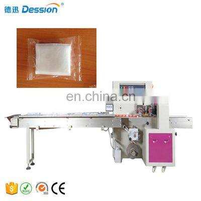 Product DescriptionAutomatic Packaging Cotton Gauze Swab Packing MachineProduct ApplicationDession Horizontal Pillow plastic fittings packaging machine widely applied for various kinds of regular objects like food, vegetable medicine, daily appliances, cosmetic,metals, industrial parts, boxes, trays, toys and etc. SPECIFICATIONS BETWEENT SIMILAR MACHINE Model DS-250X DS-350X DS-450X Film Roll Width Max.250mm Max.350mm Max.450mm Packaging Speed 40 ~ 230 bags/min 40 ~ 230 bags/min 30 ~ 180 bags/min Bag Width 30~110mm 50~160mm 60~210mm Bag Length 45~90mm or 65~190mm 90~220mm Or150~330mm 120~450mm Product Height Max.40mm Max.70mm Max.100mm Power 220V,50/60HZ,2.4KVA 220V,50/60HZ,2.6KVA 220V,50/60HZ,2.6KVA Machine Size ( L ) 3770 x ( W ) 670 x( H ) 1450mm ( L ) 3770 x ( W ) 745 x( H ) 1450mm ( L ) 3990 x ( W ) 900 x( H ) 1468mmMachine Overall LookingMain Features1.Efficient: Bag-making, filling, sealing, cutting, heating, date / lot number achieved in one time; 2. Intelligent: Packing speed and bag length can be set through the screen without part changes; 3. Profession: Independent temperature controller with heat balance enables different packing materials; 4. Characteristic: Automatic stop function, with safe operation and saving the film; 5. Convenient: Low loss, labor saving, easy for operation and maintenance. Detailed Images304 Stainless steel product conveyor Roll film holderTouch screen and horizontal sealing partBag cuttingCertifications& FairOur ServiceAfter-sale Service1. Manules/Videos of machine installation, adjusting, setting, maintenance are available for you. 2. If any problems happend and you can not find out the solutions, Telecom or Online face to face communication available 24 hours;3. Dession engineers & technician are available send to your countries for services if you agree pay the expenditure; 4. Warranty: 2 years (Electric accessories ) and free life time maintenance (Excluding freight) ; 5. Dession has an independent team for after-sale service. any emermancy pleas call the saleman or our after-sale's manager.Our Clients:During last 10 years, Dession has developed more than 30 partners all over the world ,Dession automatic packaging machine has been shipped to many countries and area such as America, Brazil, Russia, British, Germany, India, Thailand, Malaysia, Vietnam and so on.Customers FeedbackOur CompanyDession is a leading manufacturer of Rotary pillow packaging macine, Vertical powder / granules / liquid / Sauce packaging machine, Automatic Feeding line, flowing packing machine and supporting facilities since 2005. Dession has successfully developed more than 80 kinds of packaging machines and related equipment, widely suitable for food, medicine, chemicals, Industry accessories, hardware and so on. Packing & Delivery Packaging(Using plywood case) Size Main part: part:1390X820X1520mm; Ending part:2560X540X360 mm Weight 440kg Packaging Details 1)Dedust & Cleaning 2) Lubricate Drive Parts 3) Divide Machine Into Modules 4) Wrap Modules With Plastic Film 5) Packing Modules into Plywood Cases 6)Mark Shipping Mark In The Cases If any special requirements, we will pack it as requested.Delivery Time: Machine will be shipped in 15 wordking days after payment,before shipment,our technician will test the machine well,so our client can use directly when got the machine.Further information (video,pictures, technical parameter and other models) needed,pls feel free to let me know. Related ProductsAutomatic green pea fresh vegetable packing machine97.9% Response RateAutomatic Pouch Ice Pop Ice Lolly Packing Machine98.8% Response RateAutomatic Ice Cream Popsicle Packaging Machine98.6% Response Rate Automatic Packaging Cotton Gauze Swab Packing Machine BACK TO HOME