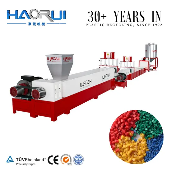 This PP PE HDPE LDPE pelletizing line is one of the machine series HAORUI PP PE HDPE LDPE film woven bag pelletizing granulator machine for plastic recycling machine HAORUI pelletizing system: