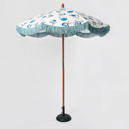 - Vintage Fringe Sun Outdoor Wooden Pole Canvas Colors Umbrella -