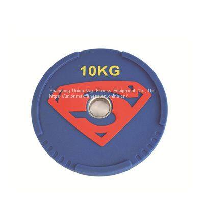 3.The weight plates feature a stylish colorful finish, Superman-inspired graphics, and a raised yellow-weight logo for easy identification.