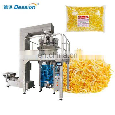 Automatic Cheese Packaging Machine Cheese Mozzarella Packaging MachineMachine IntroductionPackaging ApplicationThis machine is suitable for packing of bulk materials with high precision and fragility.Such as puffed food, casserole, candy, potato chips, nuts, frozen food, pet food, small hardware, medicinal materials, etc.Packing EffectThis machine can provide back-seal packing.It can be upgraded to add the bag with hanging holes, bag with easy tear, gusseted bag and quad sealed bag effect according to the needsMachine Structure and ParametersModelDS-320AZDS-420AZDS-520AZDS-620AZDS-720AZFilm WidthMax.320mmMax.420mmMax.520mmMax.620mmMax.720mmFilling range150~800ml150~1500ml150~2000ml150~4000ml150~400mlBag sizeL:80~240mmW:50~150mmL:80~300mmW:60~200mmL:80~350mmW:80~250mmL:150~350mmW:200~350mmL:100~450mmW:100~350mmPacking speed5~70bags/min5~60bags/min10~50bags/min5~50bags/min10~40bags/minOptional deviceAngle of plug-in device, Linking bags device, Gas-filling device, Punching deviceMachine Characteristic1)Imported PLC full computer control system, color touch screen, easy to operate, intuitive and efficient.2)Impoted servo film transport system, imported color code sensor, accurate positioning, excellent overall performance and beautiful packaging.3)A variety of automatic alarm protection functions to minimize losser.4)Flat cutting, pattern cutting, linking cutting can be realized by changing the tools;easy operation with smooth bags.5)Bag-making equipment can be changed according to specific requirement of customers and products.6)Optional English or other languages screen display, easy and simple operation. Both packaging speed and bag length can be set with one click.7)All machines have CE certification and ROSH certificate.Details ImagesMachine WorkflowThis machine is easy to operate. Just set the parameters on the screen, and then you can start the machine. Put the product in the hopper, the machine will automatically pull the film, the bag is formed, sealed, and finally the bag is cut.Easy Control Touch ScreenLanguage: Standard English and Chinese. Any language can be customized.PLC: Imported PLC microcomputer with interface and frequency control enables bag parameter setting more convenient and easier.Automatic Electronic WeighterHigh precision sensor, Making high accuracy measuring; With excellent compatibility and easy using with other parts of packingequipment. Bag Former#304 stainless steel bag former is for shaping the film into a bag.Different bag width needs different bag former.Sealing and Cutting DeviceThe wheels will pull the film to this cutting device, which will create the top and bottom of the bags.Related ProductsWhy Choose UsVR1. Professional and Strong TeamDession has a professional team that can provide customers with various packaging solutions. After fully understanding the customer's needs, we provide the most suitable packaging solution to the customer. Then start the production of the machine. We have a strong production and processing capacity, from the customized processing of accessories to the assembly and debugging ofthe machine. Finally, it is packaged and shipped, and it only takes a week to complete.2. Excellent transportation serviceAccording to the needs of customers, we can provide sea transportation, air transportation, and land transportation services, so that you can get the machine as soon as possible. Provide door-to-door transportation services.3. Timely and effective after-sales serviceChoosing us is not only buying a machine, but also our professional and timely service. 1. When the machine is delivered, we will attach a video of the installation and operation of the machine, so that you can use the machine quickly. 2. All electrical appliances of our machines have a one-year warranty, and we will replace them if they fail. 3. When your machine fails, we will have professional engineers to provide professional online after-sales service to help you solve the problem. 4. If the problem cannot be solved online, we will arrange an engineer to repair it on site within a week.Buyer FeedbackWe have 8 years of experience in foreign trade and export, and now our customers have spread to 90 countries all over the world. With our high-quality machines and professional services, we have won unanimous praise from our customers.Company ProfileDession a leading manufacturer of Packaging machine and supporting facilities, which has successfully developed more than 80 kinds of packaging machines. Dession Packaging Machine has widely applied for different fields throughout the world, such as food/ industrial food, medicines, hotel supplies, disposable goods, rubber goods, daily appliances, hardware fittings, sporting goods, toys etc. Dession has more than 8000 square meters of production plants, 5 production workshops and a parts processing workshop, including small vertical machine production workshops, vertical machine production workshops, pillow machine production workshops, cartoning machine production workshop and filling machine production workshop.FAQQ1:Do you have manual or operation video for us to know more about the machine? Yes, not only manual or operation video, 3D drawing also available to make as per your design,also the video we can make of testing the material from our packaging machine if your packing goods easier for us to find from our local market. Q2:How can I trust you for the first time business ?Please note our above business license and certificate. And if you don't trust us, then we can use trade assurance service, guarantee your money, and guarantee your machine's on-time delivery and machine quality.Q3:Is engineer available to serve oversea?Yes, but the travel fee is paid by you. So actually to save your cost, we will send you a video of full details machine installation and assist you till the end.Q4:How can we make sure about the machine quality after we put the order?Before delivery, we will send you the pictures and videos for