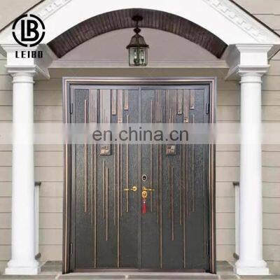 Product SpecificationBody Size0.6mm/0.8mm/1.0mm galvanized plateFalse Frame1.5mm/1.8mm Galvanized SteelFrame1.5mm/1.8mm Galvanized SteelPASSAGE MEASURES1 LEAF DOOR: 90X210 80X2102 LEAF DOORS: 120X210 110X210OUTSIDE SUBFRAME MEASURES1 LEAF DOOR: 103X217 93X217 2 LEAF DOORS: 133X217 123X217OUTSIDE PANELMelamine / Molded Veneer/PVC Steel PannelINSIDE PANELMelamine / Molded Veneer/PVC Steel PannelInsulationWith Expanded Polyurethane.Hinge BoltsOn the lateral side made of 3 mm thick steel plate in order to prevent the door's disruption.LockEuropean cylinder lock protected by anti-shock and steel defender. 1 temporary and 5 final keys.Special Anti-drill PlateBehind each security lock for added protection.Opening LimiterAlso called security block. Easy to use from the inside by a doorknob in the upper side of the door.Adjustable Draft ExcluderAutomatic drop draft- excluder ensure hermetic seal against air and light.PeepholeWide-angle lens.ACCESSORIES20 years warranty internal and external PVD accessoriesCERTIFICATE EN1627ENERGY SAVING CERTIFICATESU Value: 1, 7 W/m² KAcoustics: 34 dbWatertightness: Class 4AWindtightness: Class 5CAirtightness: Class 3Company InformationAbout UsFoshan Leibo in 1998 and developed trade business in 2005, Foshan Leibo Cunstrction Material Factory has experience inmanufacturer and exporter more than 12 years. We are specialized in the development and production of aluminium doors&windows,aluminum balcony&handrails, steel door , stainless steel door , iron sheet etc.All of our products comply with internationalquality standards and are greatly appreciated in different markets throughout the world.Our CustomerProduct CertificationProject CooperationPackingFAQQ:What is your main production ?A: We are major in making the security doors products.Such as Bulletproof Doors,Copper Doors,Security Steel Doors,etc.Q: Is your company the factory or trading company ?A: We do have our own production line of quality security doors, at the same time,with more than 10 years experience of exporting doors to all over the world, wecombine difference cooperated factories as an union to provide one-stop purchaseservice of all kinds of doors.Q: How is your packing ? A: We use different methods of packing depends on different doors and our customers'demand, and we also accept OEM of customers' brands. Usually for most of the productswe use 5- layers carton package. Q:How is your company products quality ?A:Our company products all produced in factory,by three times QC check.During produce,after produce and before pacakge .Just believe in us.We will do good quality products for you .