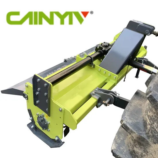 The tilling implements, which can consist of hoe, radial blade or spike assemblies mounted on a horizontal rotor (4 or 6 per flange), work by cutting and ripping clods of soil.