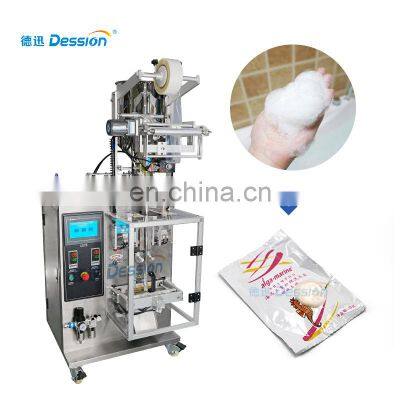 Small sachet shampoo liquid soap automatic filling and packing machie factory priceSmall sachet shampoo liquid soap automatic filling and packing machie factory price can packing tamato sauce sauce juice jam BBQ sauce peanut butter and etc.IF you have any question can conect us,thanksProduct Description PRODUCT APPLICATION MACHINE PARANETERSPECIFICATIONS ModelDS-200YMeasuring Range1~ 100mlPackaging Speed30 ~ 80 bags/minBag Width30 ~ 180mmBag Length15 ~ 100mmFilm Roll WidthMax.200mmPower220,50HZ,1.2KVAMachine Size( L ) 640 x ( W ) 700 x( H ) 1580mmMachine Weight300kgPACKAGE SAMPLE Company Information CUSTOMER FEEDBACK OUR AFTER SEAL SERVE1. Manules/Videos of machine installation, adjusting, setting, maintenance are available for you. 2. If any problems happend and you can not find out the solutions, Telecom or Online face to face communication available 24 hours; 3. Dession engineers & technician are available send to your countries for services if you agree pay the expenditure; 4. Warranty: 1 year (Electric accessories ) and free life time maintenance (Excluding freight) ;FAQ1.Customer: How do I find a Packing machine model suitable for my product? Tell me about your product details.1. What kind of product you have.2. The bag/sachet/pouch size ( the length, width).3. The weigh of your product for each bag is sometimes neccessary told(it depends what specific product you have).4. Your requirement for the machines and the bag types.2.Customer: How about the delivery time? All our machines are tailor-made because different clients have different requirements,delivery will be within 20 days for the small packing machines.For the large-scale machine, it takes longer.3.Customer: Can you offer some video or pictures of the packing machine? Yes, of course. Besides, we can help you to have your products packaging if you are available to send us some of your product and then record a video for your reference. 4. Are you factory or trading company? We are the factory, and especially R&D, manufacture and sell various packing euipments. We have engaged in the packing R&D and production over 10 years. 5. How can we make sure about the machine quality after we put the order? Before delivery, we will send you the pictures and videos for you to check the quality, and also you can arrange for quality checking by yourself or by your contacts in Guangzhou. Small sachet shampoo liquid soap automatic filling and packing machie factory price