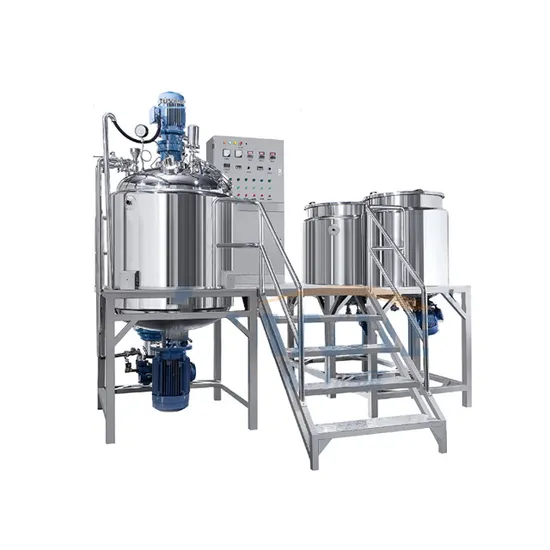 The vacuum homogenizing emulsifier mixer is mainly composed of water pot,oil pot,emulsifying pot, vacuum system, lifting system(optional), electronic control system (PLC is optional), operation, etc.