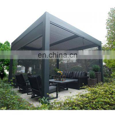 Product DescriptionManual aluminum pergola with 100% water proof function provide amazing outdoor space for your sweet home.Product Name:pergolas aluminumStandard size:Length,width ,height:3x3x2.5 meter ,3x4x2.5 meter ,4x3x2.5 meter ,3.6x3.6x2.5 meterPost size:135x135x2mm aluminum profileBeam size:130x48x1.8mmGutter size:51.5x40x1.6mmLouver size:88x30x1.2mmBase Plate size:200x200x4mmColor:Grey and whiteLED lightsUnder louver panelMOQ10 sets , if you want small qty we can also welcome just the cost will be a bit higher than MOQ 10 setsmanual aluminum pergola parts and sizes:You can install the side curtains for this aluminum pergola which with very good water proof and heat insulation function, we can provide manual and electric curtains ,pls check the details for the side curtain as below:We will test each aluminum pergola and inspect the size before paint and ship to avoid any mistake and will send the testing videos and pictures to our clients .ProjectUSD Aluminum pergola projectGermany Aluminum pergola projectUK Aluminum Pergola ProjectFactory and PackageFAQQ1:How to guarantee the quality of the products?We have our own QC team to control the products quality for all our clients'orders before loading.Q2:How long does it take to install a louvres roof /pergola?It depends on te skills,help and tools, usual 2-3 workers will finish the installation 50m 2 in one day.Q3:It is the louvre roof /pergola rain proof?Yes,the normal weather cnditions,even heavily rain,the roof /pergola will not let in rain.Q4:How does the rain sensor work?The control system normally programmed to close the louvres when rain is detected.Q5:Are louvres roof/pergola energy efficient?The adjustable louvres blade help to reduce heating and controlling the amountof direct sunlight.Q6:Can the louvres roof/pergola used next to the sea?All accessories in aluminium alloy,stainless steel and brass to avoid any rust and corrosion.Q7:How we do business?Take care of your prducts and serve your needs.Contact us by E-mail or by phone. Other Main Products