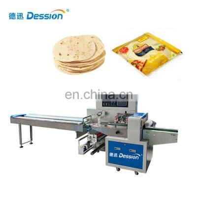 Automatic Tortillas Packing Machine Tortilla Wrap Packing MachineMachine IntroductionPackaging ApplicationAutomatic flow packing machine is a widely used packing machine. Suitable for all kinds of product packaging. Including medicalsupplies, vegetables and meat, baked bread, snacks and candy, daily necessities, hardware accessories, etc.Packing EffectThe effect after packaging is back-seal bag. According to demand, other devices can be customized or upgraded to meet other models. For example, pillow bag with hole, bag with label, gusset bag, etc.Machine Structure and ParametersMachine Characteristics1. Double frequency conversion control, the bag length canbe set and cut, no need to adjust the air, one step in place, saving time and film.2. Man-machine interface, parameter setting is convenient and quick.3. Fault self-recognize function, fault display at a glance.4. High-sensitivity photoelectric eye color tracking, digital input sealing position, make sealing position more accurate.5. Temperature independent PID control, better suitable for various packaging materials.6. Positioning stop function, no sticky kuife, no waste film.7. The transmission system is simple, the work is more reliable, and maintenance is more convenient.8. All control is implemented by software, which is convenient for function adjustment and technical upgrade, and never lags behind.ModelDS-250XDS-350XDS-450XDS-600XDS-700XDS-800XFilm Width(mm)Max.250Max.350Max.450Max.600Max.700Max.800Bag Length(mm)45~33065~330120~450130~450120~600120~600Bag width(mm)30~11050~16060~21060~28050~33050~380Products Height(mm)Max.70Max.80Max.110Max.150Max.150Packing Speed(bag/min)40~23030~15030~15020~12030~150Machine Power220V / 380V, 50/60HZ,2.4KWMachine Size(L*W*H, mm)3920*670*13204020*720*14503900*900*14683990*1000*14684400*1100*14604400*1200*1460Machine Weight800KG900KG900KG1050KG1050KG1050KGDetails ImagesMachine WorkflowThis machine is easy to operate. Just set the parameters on the screen, and then you can start the machine. Put the product on the conveyor belt, the machine will automatically pull the film, the bag is formed, sealed, and finally the bag is cut.Multilingual touch screenThe machine supports various language customization, easy to operate.High sensitivity eye sensorThe eye sensor automatically senses the color code to ensure accurate and beautiful packaging effects.Replaceable bag formerWhen you want to change the bag width, you only need to change a different size bag fromer.Electronic control componentUse Panasonic PLC and frequency converter to ensure the stable operation of the machine.Related ProductsWhy Choose UsVR1. Professional and Strong TeamDession has a professional team that can provide customers with various packaging solutions. After fully understanding the customer's needs, we provide the most suitable packaging solution to the customer. Then start the production of the machine. We have a strong production and processing capacity, from the customized processing of accessories to the assembly and debugging ofthe machine. Finally, it is packaged and shipped, and it only takes a week to complete.2. Excellent transportation serviceAccording to the needs of customers, we can provide sea transportation, air transportation, and land transportation services, so that you can get the machine as soon as possible. Provide door-to-door transportation services.3. Timely and effective after-sales serviceChoosing us is not only buying a machine, but also our professional and timely service. 1. When the machine is delivered, we will attach a video of the installation and operation of the machine, so that you can use the machine quickly. 2. All electrical appliances of our machines have a one-year warranty, and we will replace them if they fail. 3. When your machine fails, we will have professional engineers to provide professional online after-sales service to help you solve the problem. 4. If the problem cannot be solved online, we will arrange an engineer to repair it on site within a week.Buyer FeedbackWe have 8 years of experience in foreign trade and export, and now our customers have spread to 90 countries all over the world. With our high-quality machines and professional services, we have won unanimous praise from our customers.Company Profile Dession a leading manufacturer of Packaging machine and supporting facilities, which has successfully developed more than 80 kinds of packaging machines. Dession Packaging Machine has widely applied for different fields throughout the world, such as food/ industrial food, medicines, hotel supplies, disposable goods, rubber goods, daily appliances, hardware fittings, sporting goods, toys etc. Dession has more than 8000 square meters of production plants, 5 production workshops and a parts processing workshop, including small vertical machine production workshops, vertical machine production workshops, pillow machine production workshops, cartoning machine production workshop and filling machine production workshop.FAQQ1:Do you have manual or operation video for us to know more about the machine? Yes, not only manual or operation video, 3D drawing also available to make as per your design,also the video we can make of testing the material from our packaging machine if your packing goods easier for us to find from our local market. Q2:How can I trust you for the first time business ?Please note our above business license and certificate. And if you don't trust us, then we can use Alibaba trade assurance service, guarantee your money, and guarantee your machine's on-time delivery and machine quality.Q3:Is engineer available to serve oversea?Yes, but the travel fee is paid by you. So actually to save your cost, we will send you a video of full details machine installation and assist you till the end.Q4:How can we make sure about the machine quality after we put the order?Before delivery, we will send you the pictures and videos for you to check the quality, and also you can a