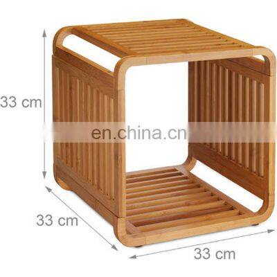 Products DescriptionProduct ParamentersNameCreative Design High Quality Bathroom Living Room Square Cube Bamboo Storage ShelfColorBambooMaterial100% Natural BambooSize33x33x33cmPackingBrown box and shrinkPortXiaMen,FuZhouPaymentL/C,T/T,Alibaba trade assurance,Western UnionDescription1.Made of durable natural bamboo known to be environmentally friendly, stronger and more beautiful than regular wood.2.Ideal for serving breakfast, dinner, wine, or just anything else, or use for an elegant decoration display.3.Elegant sides with wide handles for easy grip. Surrounding tray lips prevent items from falling over.4.Hand wash with mild soap warm water, for extended life of tray use bamboo oil occasionally.Pelative ProductsFactory introductionProduct packagingFAQ