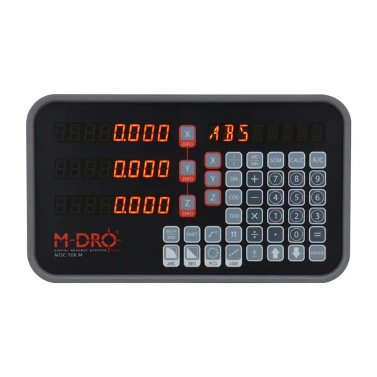 Key Features The M-DRO MDC700-3M two axis display offers a high performance console with dedicated milling functions. Functions include; mm/inch, PCD, line of holes, 200 SDM zero memory, arc contouring and incline milling Easy to read filtered LED display with adjustable brightness settings to provide a wide viewing angle in a variety of ambient lighting conditions Each axis has standard 15mm high 7 segment LED displays and an alpha-numeric instruction display window provides feedback to the operator during function setup and processing The console features a sturdy die cast metal housing, which offers a very solid feel compared to plastic cased models Mounting the console is made simple with an angle adjustable bracket and M10 stud fitted to the underside of the housing. A range of mounting arms are available separately Durable and wipe clean front panel graphic overlay with PCB mount switches for reliability User friendly front panel layout with dedicated zero key for each axis and clearly identifiable function keys 2 year warranty and full technical support by our team of service engineers Additional interfaces are available to combine axis together or convert the input to suit other manufacturers equipment Please feel free to contact our technical staff for assistance as we will be able to help you choose the best set up for your machine Dimensions: (W) 162mm, (L) 278mm, (H) 68mm