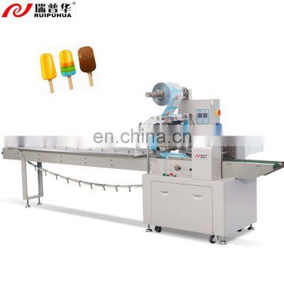 Fully automatic horizontal wrapping flow pack packing machine ice cream lolly popsicle packaging machine Horizontal Pillow Bag Automatic Flow Pack Wrapping Machine Three Servo Packaging Machine is mainly used for various kinds of solid objects with regular shape (Square/ Rectangle/Circular/Ellipse/Flake etc.) such as food, pharmaceuticals tools, daily necessities, hardware, or any other products loaded in box or tray. ModelZP-500SGPackaging speed(bag/minute)35-300bag/minPacking sizeL60-Infinite W30-150 H5-50Maximum width of film(mm)<400mmThickness of film(mm)0.03mm-0.05mmTotal power220V,50/60HZ,6.3KWOverall size(mm)(L)4000*(W)960*(H)1600mmWeight550kgPackage4.0CBM,2CASESOverall size (mm)OPP/CPP, PT/PE, KOP/CPP, ALU-FOIL etc. (1) Menu storage and memory functionThe controller can save a variety of parameter configurations, and the recipe can be used when the product or packaging film is replaced by calling out the formula on the touch screen. (2) Bag length unlimitedThe industry-leading electronic cam algorithm, the bag length range is from 60mm to unlimited length, the bag length is set and cut immediately in one step, saving time and film. (3) No product, no bag function/ Anti-cutting functionAdvanced electronic anti-cutting, electronic anti-empty bag algorithm. The empty material film stops, saving packaging materials. (4) 3-Servo motor/PLC controlThe horizontal seal is controlled by an independent servo motor, and the longitudinal seal and the feeding tailstock are controlled by a frequency conversion motor. The mechanical structure is simple, the operation is stable, and the noise is low. (5)High precisionThe feeding speed is automatically tracked, and the packaging machine automatically accelerates and decelerates. High speed, higher precision, double knife speed can reach 300 packs/min, error ±1mm. (6) Man-machine interface, convenient and quick parameter setting, automatic tracking of color code, automatic correction of cutting length. Digitally input the sealing and cutting position to make the sealing and cutting position more accurate. (7) The fault is automatically diagnosed, and the fault display is clear at a glance. (8) Well-known brand servo motor/controller/touch screen, vertical sealing/discharging belt brush. (9) Optional configuration: coding machine, double support paper, automatic film connection, inflation, spray alcohol, lifting panel, stainless steel machine body. Why choose us? 1)Why should you choose Ruipuhua(Rapid) Packaging machinery ?Ruipuhua(Rapid) is specializing in packing machine for more than 10 years,with good quality and competitive price. 2)Can you provide after-sale service?Of course,we have engineers available to service machinery overseas . 3)Can I visit your factory and send workers for learning ?Yes,we will provide you with training for the workers. 4)What is Our Advantages?1. Provide customized services for special requirement;2. Competitive price and reliable quality;3. Professional inspection department to guarantee quality. 5)How to Contact Us?Send your Inquiry Details in the Below, Click "Send" Now!