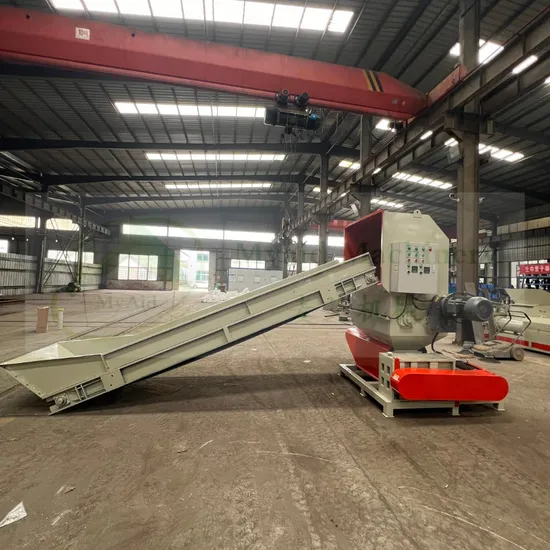Conveyor for feeding materials is optional.It is 4m length as our standard size.The conveyor is belt and steel thickness is good.It can efficiently help worker to continuous to feed.It also gives safety to workers.Cause it keep works far away from hopper which has crushing shafts inside.