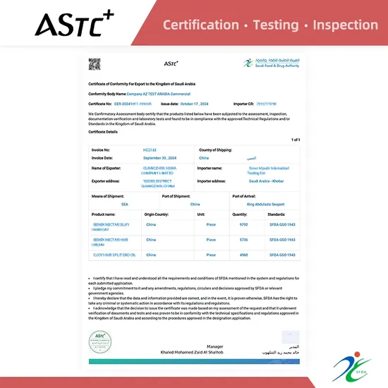 For certification: ASTC+ is authorized by the Middle East GSO organization, Saudi Arabia SASO, and Egypt GOEIC organization. It is capable of issuing CoC and GCC certificates (for toys and home appliances), Saudi Arabia SABER PCoC and SCoC, Egypt ILAC COI, and Africa COC certificates for export companies, among others.