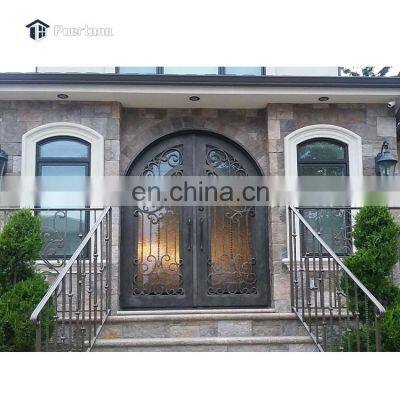 Apartment Decorate Arches Villa Entrance Iron Glass Main Door Grill DesignProduct Description Product Name:Wrought iron doorMaterial:Wrought ironColor:Matt black;white;ultra silver;clear anodized;CustomizedSurface Treatment:1. Powder coated2. Anodized3. ElectrophoresisAntirust WayGalvanizing(hot dip) or zinc spraying, antirust paintingGlass:Tempered GlassPerformance:Heat & Sound insulation and WaterproofDoor HandlingLeft/handle-Hand / Outswing or inswingPacking:1. EPE + Waterproof plastic film2. EPE + Waterproof plastic film + Wooden frame3. EPE + Waterproof plastic film + Wooden caseCompany Information Founded in 2010,Foshan Puertana building materials Co.,Ltd. is a modernized enterprise that specializes in high-end aluminum alloy doors&windows,solid wooden doors,sunrooms and shower rooms etc, integrating R&D,manufacturing,sales and service.It covers 30,000 square meters, and has over 500 staffs. With the daily growing brand of PUERTANA and superior research team to make low carbon environmental products, PUERTANA has reached the goal of competitiveness. The products have gained many national patents by the external appearance,structure and practicability. Dedicated to strict quality control and thoughtful customer services, our experienced staff members are always available to discuss your requirements and ensure full customer satisfaction. We are One Stop Building Materials Supplier , we mainly working with the Housing Builder, Developer, Contractor and individul houses , most of our customers from North America , Europe , Australia , and our products can meet the local Building Code. Packaging & Shipping Our Services ProjectsFAQQ: What's your MOQ?A: Our MOQ for aluminum products are 10m2, for wood doors is 10 sets. Q: What's your payment term?A: T/T 30% deposit, full balance against delivery Q: Can you help with delivery?A: Yes, we can do FOB, CFR, CIF, DDU. Q: What's your period of production time?A: Normally it's 25-30 days. It's negotiable. Q: Will you check the products' quality before delivery?A: Yes, we have QC department so we can make products 100% good for you. Q: What color can you do for the products?A: We have standard colors for every product. But we can customize it for you.Contact