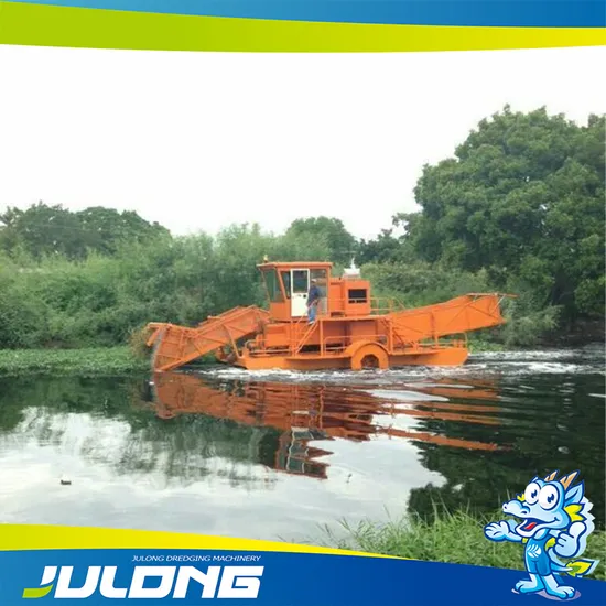 JULONG aquatic weed harvesters (or water weed harvesters, or aquatic trash skimmers) are usually used in river, lake, reservoir and coasts for cutting, collecting, storing and transporting waterweeds and floating garbage. The harvester can not only cut and collect all kinds of aquatic weeds, reeds, water hyacinth, but also collecting garbage, leaves and other waste in water. All of the equipment can work automatically and can save much labor force for its high efficiency. It is driven by hydraulic system and operated by one person, with the characteristic of simple structure, flexible movement and easy operation, which makes it an important environment friendly machine in water cleaning.