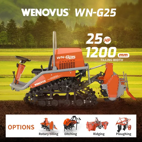 It can perform operations such as rotary tillage, ridging, furrowing, soil cultivation, and weeding. Suitable for rotary tillage and field management operations in mountainous areas, hills, orchards, vegetable gardens, and greenhouses. The entire machine has a compact structure, novel design, and good passability. It has a maneuvering handle in front of the machine, the driver can operate the machine on foot with hand-held, it is safer to climb uphill and downhill, and has stronger off-road capability. Suitable for paddy fields and various dry land operations. Equipped with a high-performance twin-cylinder engine that can provide stronger power, an optimized transmission adopts 6 front and 2 reverse, and the wider plowing width makes the operation efficiency more efficient. Standard PTO interface adapts to various implements. The steering wheel is equipped with a power assist design, making it easy to turn, automatically returning to center, and providing soft and comfortable handling. The engine is rear mounted and fully covered with insulation, noise reduction, and shock absorption design, effectively reducing the impact of noise and vibration on the driver. Equipped with high treaded delta tracks with low grounding pressure for protected paddy and dryland operations. Uses one-sided braking for turn around in the same place