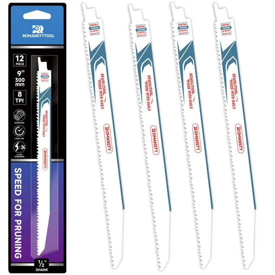 2.Respond to the growing demand for cutting tough materials in the demolition and renovation markets. 3.Carbide Technology,Up to 50x longer life than bi-metal reciprocating saw blades. 4.Wood and Metal Demolition,6 teeth per inch teeth design is ideal for cutting through all tough wood and metal materials, outstanding lifetime even when cutting high-alloy steels. 5.Ultimate cutting performance,Easy to cut advanced materials where bi-metal blades fail quickly, such as stainless steels, high-alloy bolts or hardened screws. 6.Design for Toughest Materials, Each carbide tooth is precision ground and individually welded, provides ultimate flexibility and impact strength needed for heavy duty demolition work.