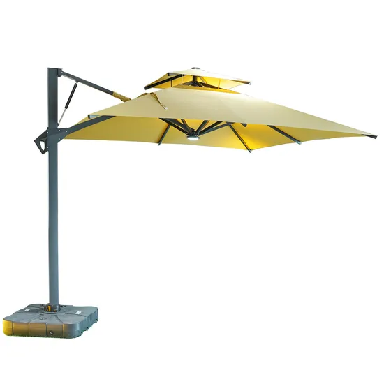 | Product Feature | 1)pole:96*64mm, thickness 2.5mm; 2)slanting pole:55*30mm,thickness 2.5mm; 3) ribs:20*30mm, thickness:1.2 mm; 4)pulling handle:59*30mm, thckness 2.5 mm; 5) turn around at 360 degree; 6) waterproof polyester fabric 260 g ; 7)90 kg marble base with wheels/or 130 kg water tank base; 8)ribs and pole are aluminum, hubs and hinges are nylon+ABS, big aluminum handle. |