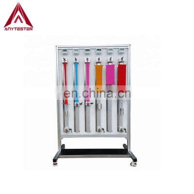 Product DescriptionSeries Stretch And Recovery TesterHY067 Series Stretch and Recovery Tester is designed to the fabric stretch, fabric growth and fabric recovery of fabrics woven in whole or part from stretch yarns and knitted fabrics.Fabric Stretch under a Specified Tension-Bench marks of a known distance are made on the fabric specimens. A specified tension is applied to the fabric specimen by hanging static weights onto it and the resulting distance between bench marks while the specimen is under the tension is measured. The fabric stretch is calculated from the length difference between benchmarks prior to application of the tension and while under the tension. Fabric Growth after a Specified Tension-Bench marks of a known distance are made on the fabric specimens. A specified tension is an applied to the fabric specimen by hanging static weights onto it. The tension is removed and after various time intervals, the relaxed distance between the bench marks is re-measured. The fabric growth is calculated from the length difference between the bench marks prior to application of the tension and after relaxation.Fabric Growth after Stretching to a Specified Extension-Bench marks of a known distance are made on the fabric specimen. The specimen, paired to one used in the fabric stretch test, is held at a specified extension for a prescribed period of time. The tension is the removed from the specimen and the distance between the bench marks is measured after the specimen has been allowed to relax for various time intervals. The fabric growth at each time interval is calculated from the distance between the bench marks of the specimen prior to stretching and the length after each relaxation period at zero tension. Fabric Recovery-fabric recovery is calculated as the percentage of the fabric growth recovered with respect to the fabric growth determined after tension and/or after a specified extension obtained at the various relaxation intervals. SpecificationModelHY067AHY067BStandardASTM D3107ASTM D3107ASTM2594Number of working positions6Length of standard scale1000mmNumber of timers6Weight3lb compound weight (including mass of sliding seat and hang weight)4lb compound weight (including mass of sliding seat, hang weight and 1lb add weight)3lb compound weight (including mass of sliding seat and hang weight)4lb compound weight (including mass of sliding seat, hang weight and 1lb add weight)5lb compound weight (including mass of hanger and hang weight)10lb compound weight (including mass of hanger, hang weight and 5lb add weight)Dimensions1080×610×1680(W×D×H)Details and Features★Suitable for fabric stretch, fabric growth after a specified tension or stretching to a specific extension and fabric recovery;★Equipped with special elongation ruler, convenient to mark, measure and calculate;★Equipped with a timer for each working position, convenient to record testing time;★Rapid clamps, rapidly and effectively clamping fabric specimens;★Flexible sliding seat for clamps with positioning blocks can be fixed randomly at any position on the guide rail;★Guide rail and clamps made of high-quality aluminum alloy with sandblasted oxidation surface;★Frame made of high-quality industrial aluminum, thicker and stronger;★Weights made of SUS 304 stainless steel, resistant to corrosion and rust;★Level-adjustable trundle, convenient to move and locate.Our CompanyPacking&DeliveryPackage Packaging Details1. The equipment is covered with film is protect it from water vapour during the trip.2. The box is filled with foam to protect the equipment from impact. 3. Exported wooden box made from plywood, don't need fumigated.PaymentPayment Term T/TEXW 30% T/T in advance, paid the balance before shipmentFOBCFR(C&F) 30% T/T in advance, paid the balance against copy of B/LCIFL/CL/C amount above 50,000 usd, we can accept L/C at sightWest UnionAmount lower than 5000usdDelivery Time7~10days after receiving payment for one containerContecting Us